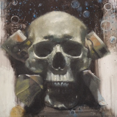 teschi riempiti di banconote che escono dalle cavità come tibie incrociate, teschi coronati da diademi che ricordano For the love of God il cranio tempestato di diamanti di Damien Hirst.