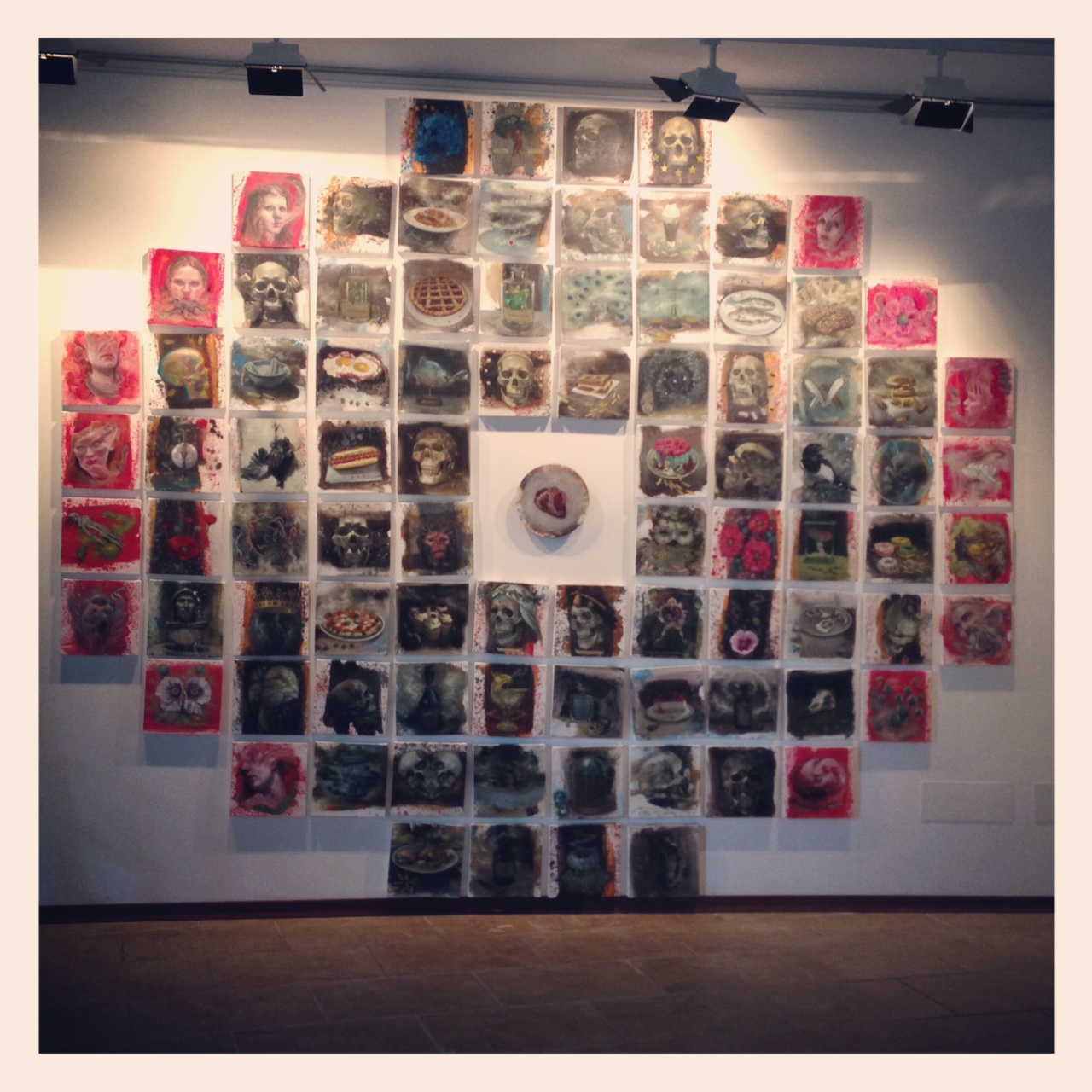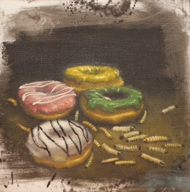 Quasi una serie nella serie sono le tele raffiguranti teschi, eterni, atemporali che completano questo quadro di indagine diacronica. Teschi coperti di insetti che ammiccano all’analogo soggetto dell’ Et in arcadia ego di Guercino,