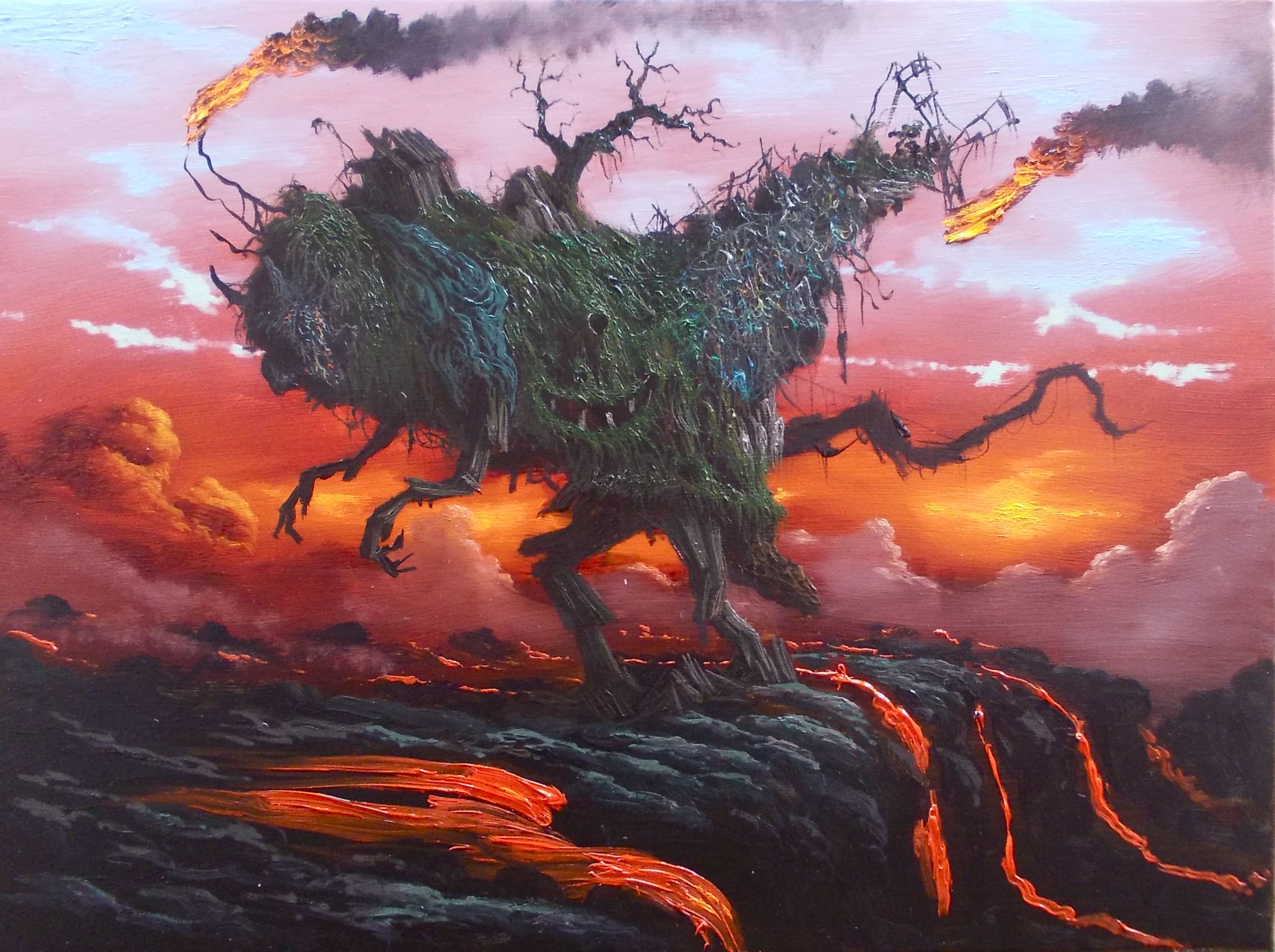 La nuovissima serie di opere della sua ultima monografica alla Galleria Giovanni Bonelli di Milano cattura il visitatore che si sente prima incuriosito e affascinato, poi avvinto progressivamente da quelle spire vegetali, antropo o zoomorfe, che ne avvolgono l’attenzione trascinandolo dentro il quadro.