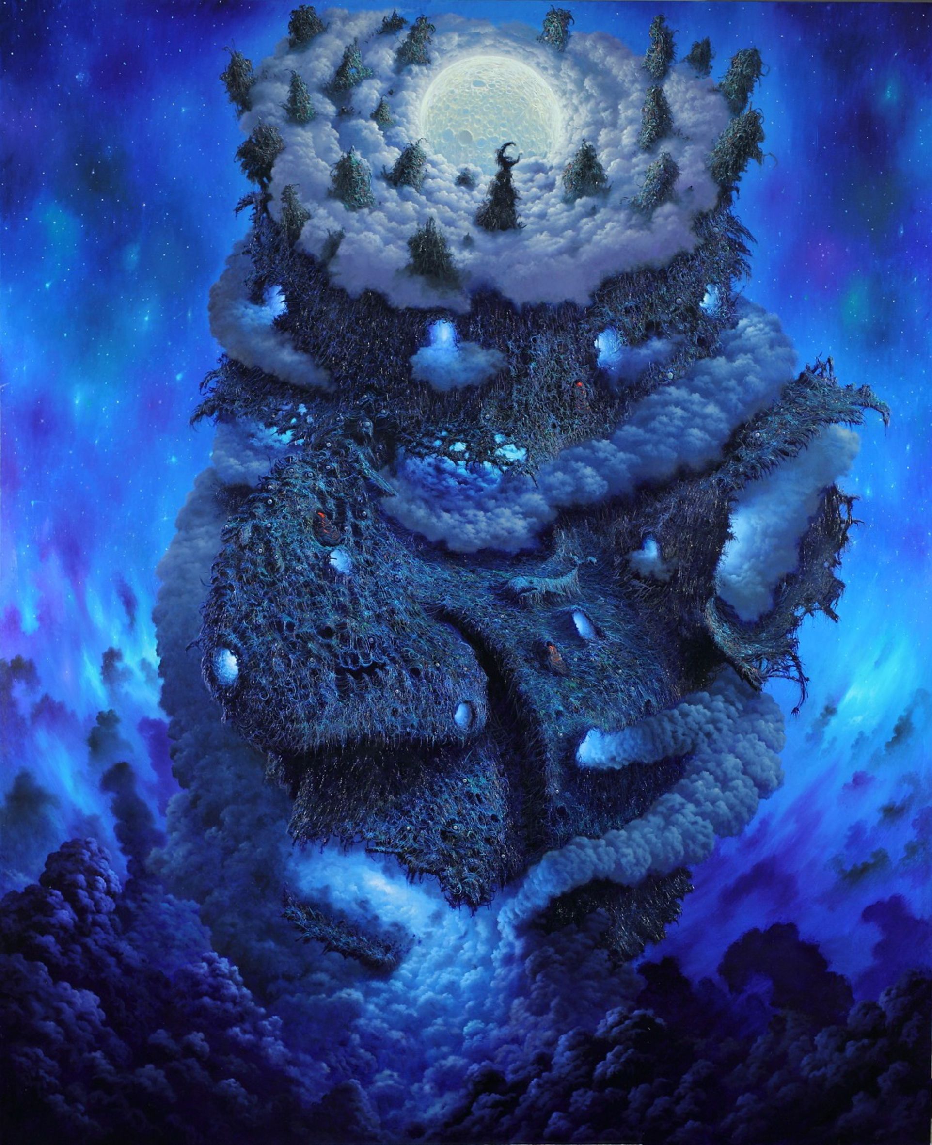 Ciò che forse mi ha più affascinato, dal punto di vista pittorico, in questa nuova serie è la strabiliante capacità luministica con cui l’artista crea intensi e lunari notturni, drammatici controluce e quel meraviglioso effetto della luce che filtra dalle finestre delle sue costruzioni fantastiche diventando uno degli strumenti attraverso i quali veniamo risucchiati nei quadri.