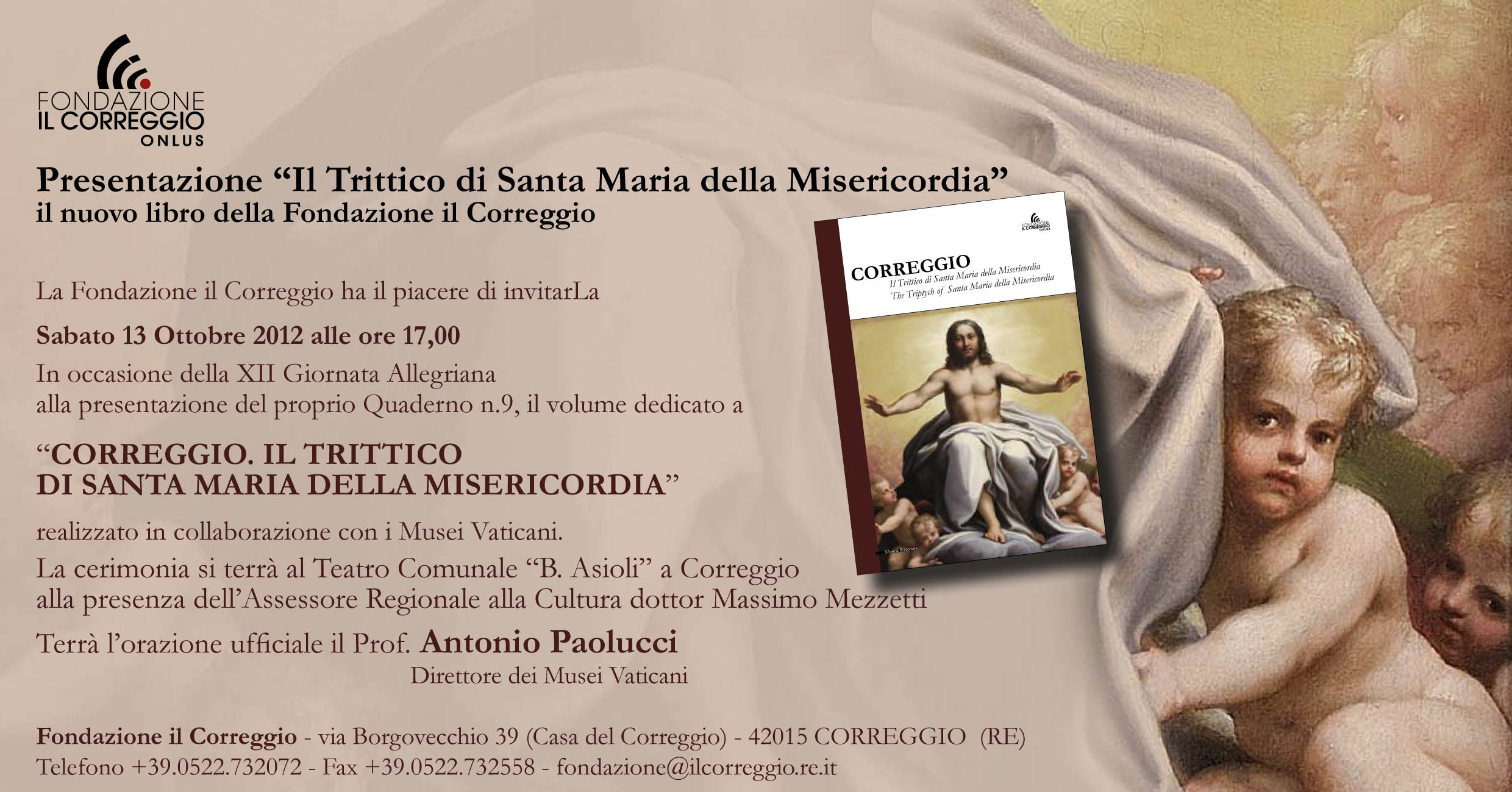 Il libro, realizzato dalla Fondazione Il Correggio in collaborazione con i Musei Vaticani, è la storia di un’importante scoperta artistica: la riattribuzione al Correggio di un’opera meravigliosa per tanti anni misconosciuta dalla critica: la tela centrale (e unica superstite) del Trittico della Misericordia realizzato tra 1520 e 25 circa per la Chiesa di Santa Maria della Misericordia di Correggio.
